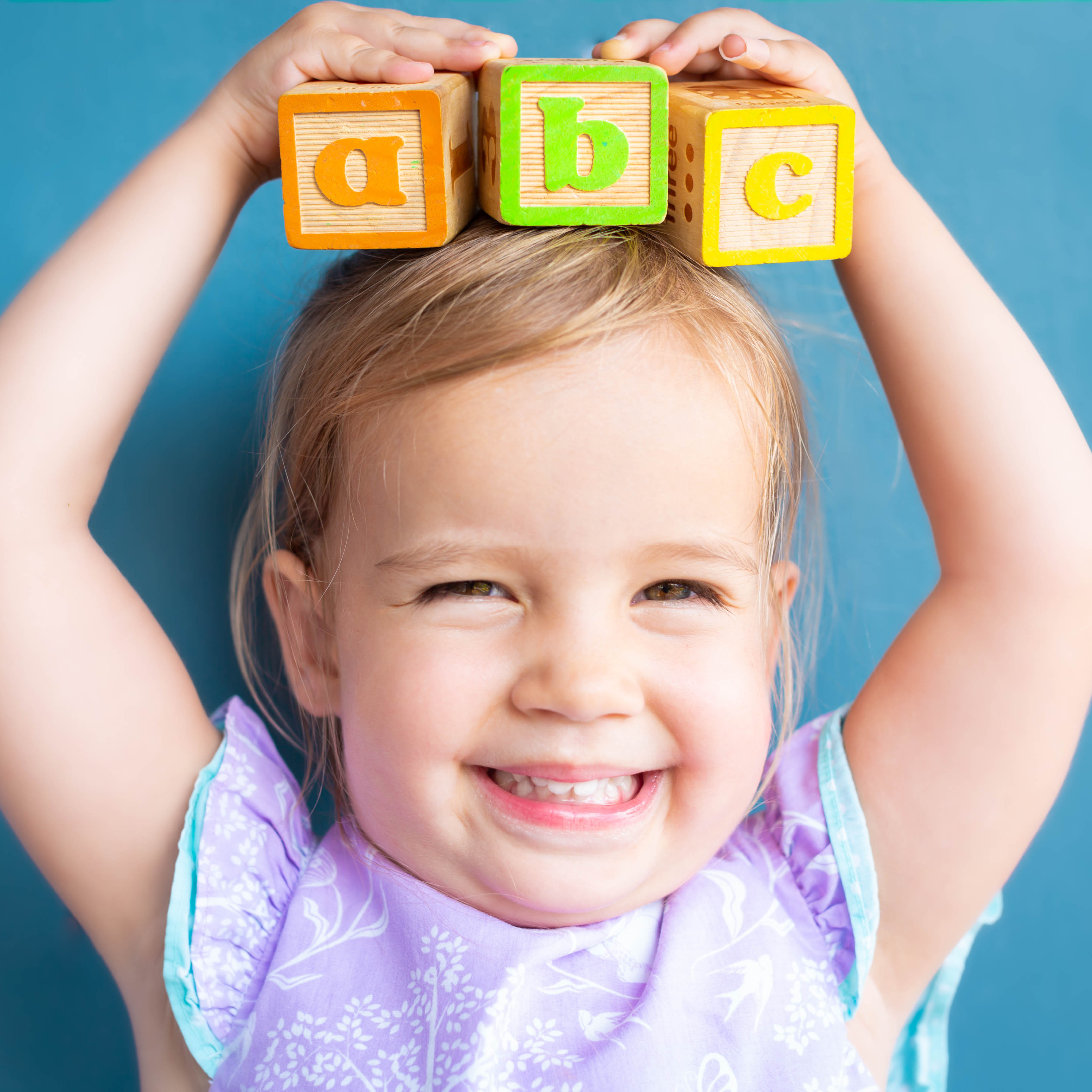 Smiling child holding letter blocks on their head
